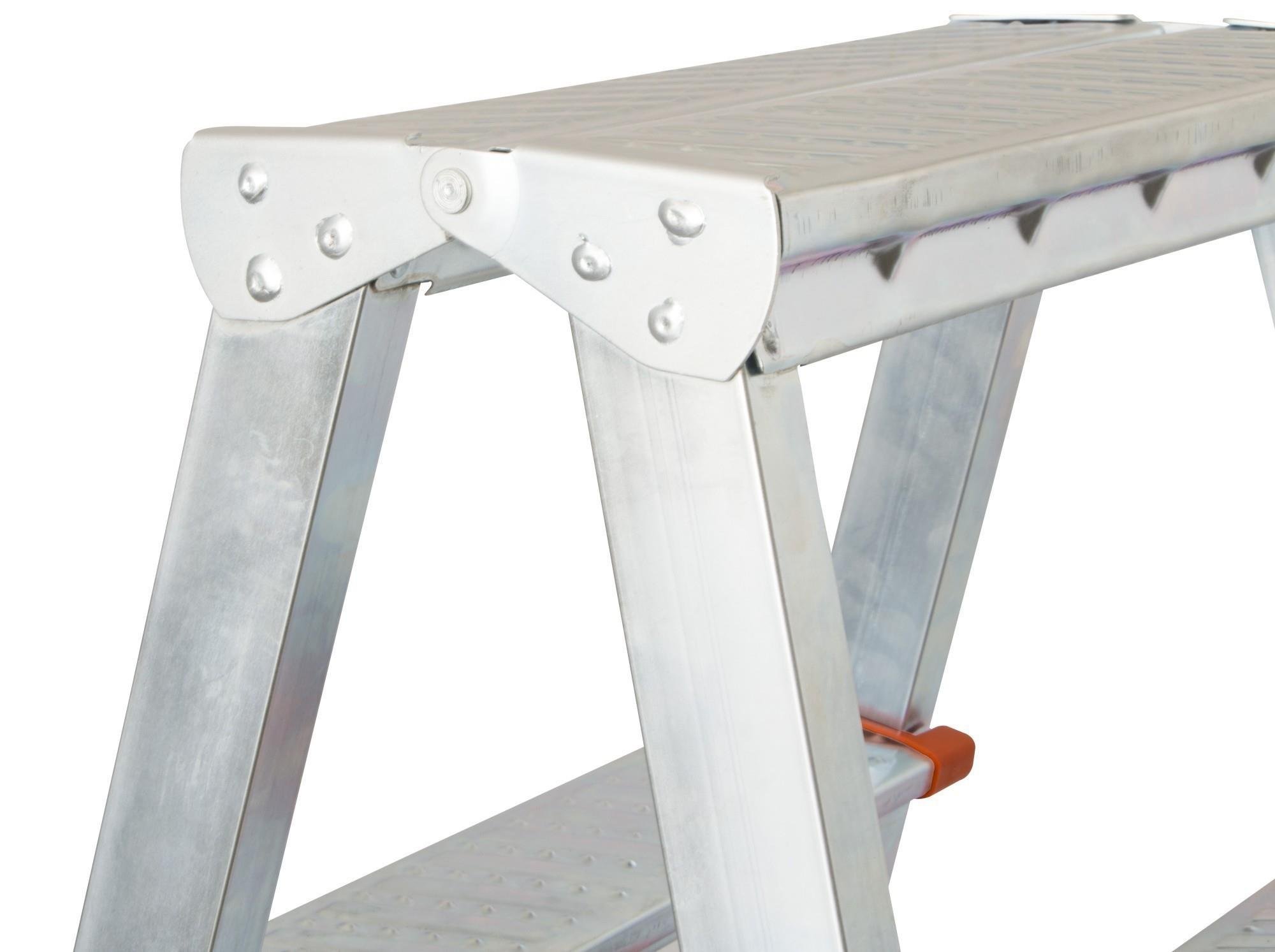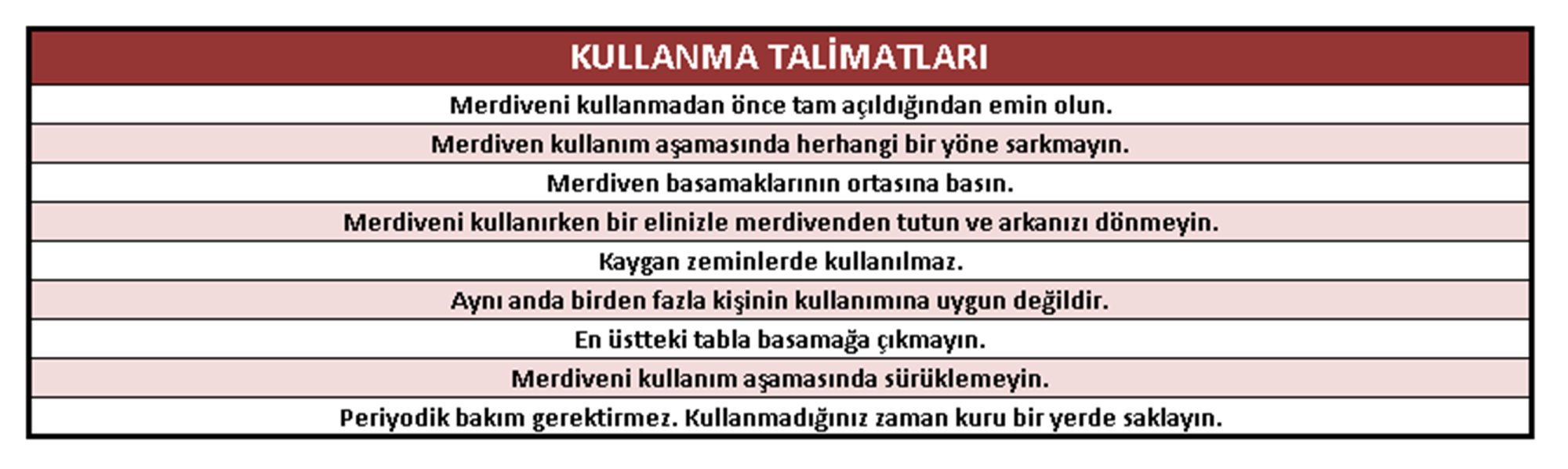 Kaymaz geniş basamaklar, kilitli menteşe sistemi ve denge sağlayan plastik taban takozları ile güvenli kullanım imkânı sağlar. Katlanabilir ergonomik tasarımı sayesinde taşımada ve depolamada büyük kolaylık sunar.