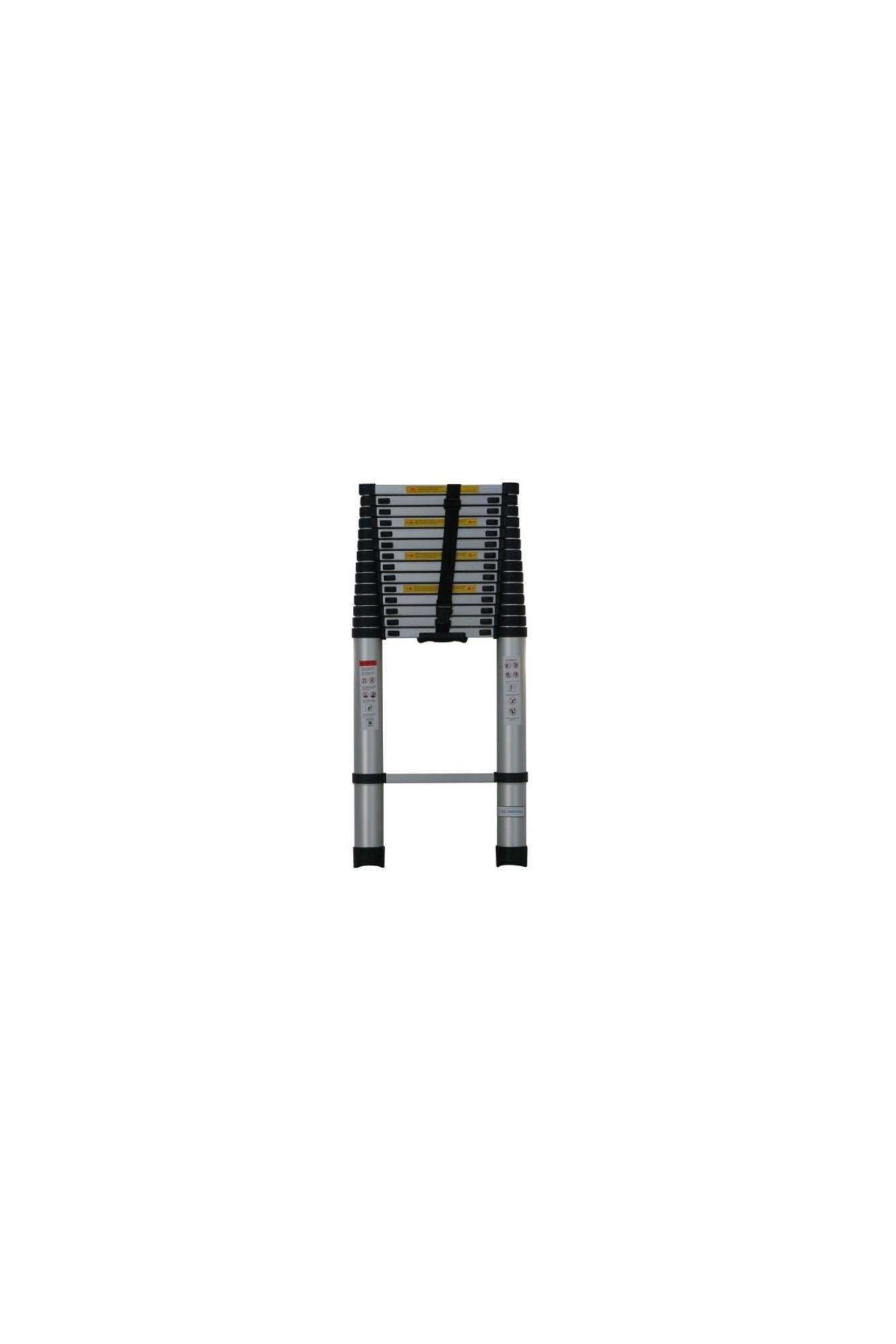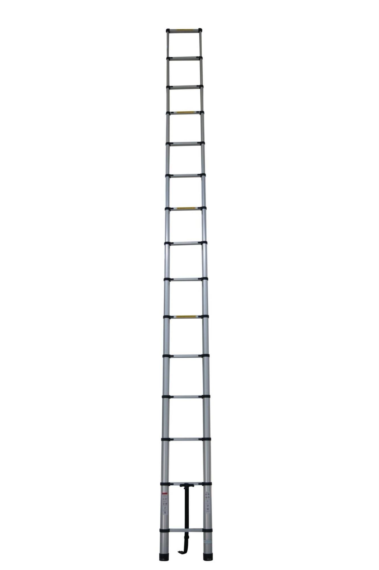 Elmas Serisi - 3,8 m 13 Basamaklı Teleskopik Alüminyum Merdiven,hafif, dayanıklı ve pratik kullanıma uyguntasarımıyla ev, bahçe, ofis, depo, inşaat ve bakım-onarım işlerinde güvenle kullanılabilir.EN131 standartlarına uygunolup, 150 kg taşıma kapasitesine sahiptir.